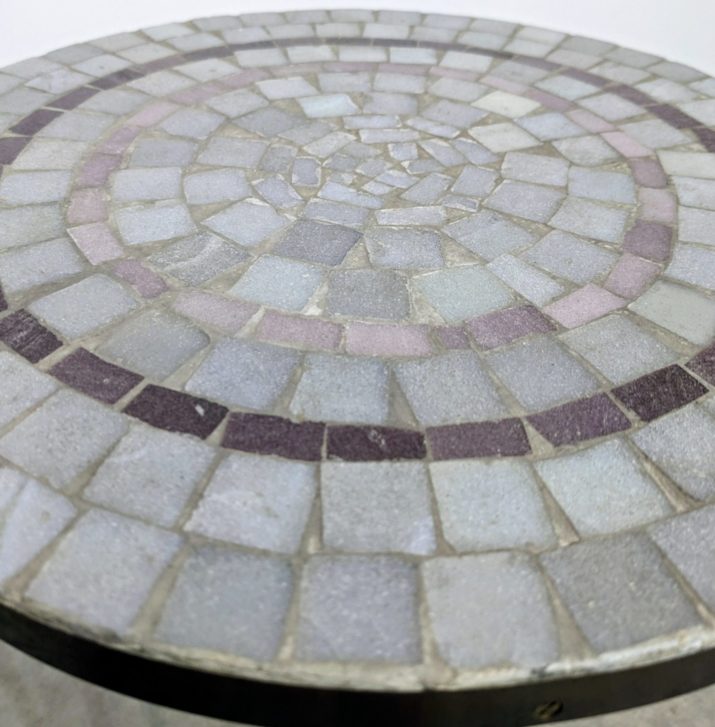 Piètement en laiton. Plateau en mosaïque, tons violets.